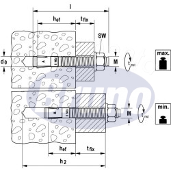 FBN II è idoneo anche per installazione distanziata grazie alla filettatura lunga che consente l’utilizzo di un dado/controdado (non in dotazione) per la regolazione della distanza dal supporto. Per portare in coppia il tassello applicare il serraggio al supporto attraverso la rondella e il dado in dotazione.