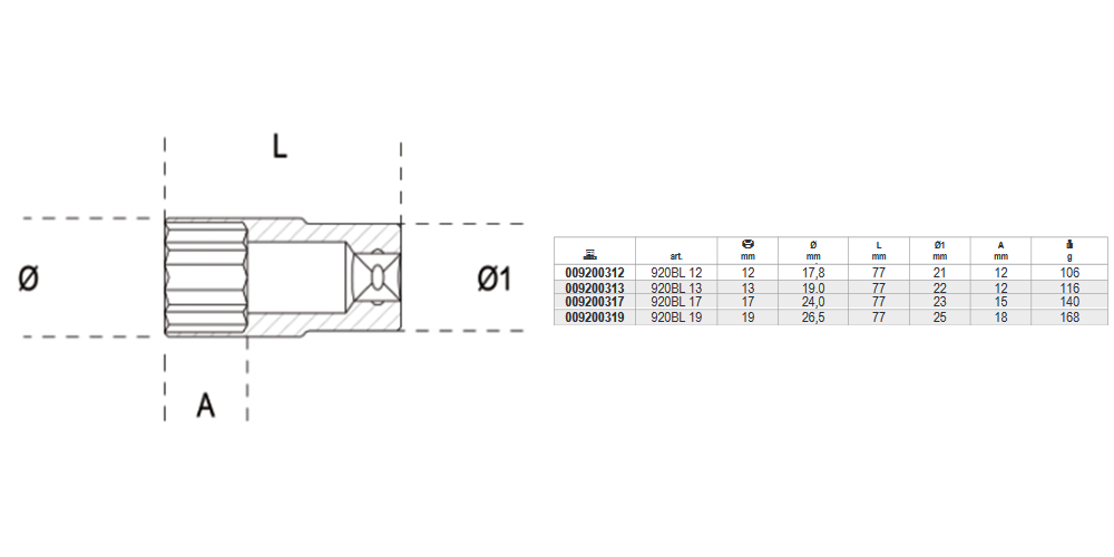 Chiavi a bussola con attacco quadro femmina 1/2", tipo lungo bocca poligonale, cromate art. 920BL