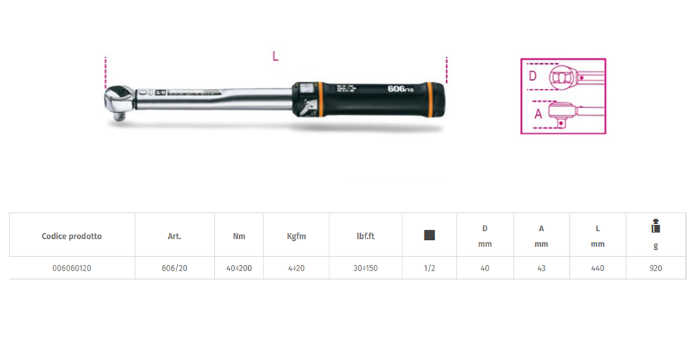 Chiavi dinamometriche a scatto con cricchetto reversibile per serraggi destrorsi precisione di serraggio ± 4% 1/2" art. 606/20