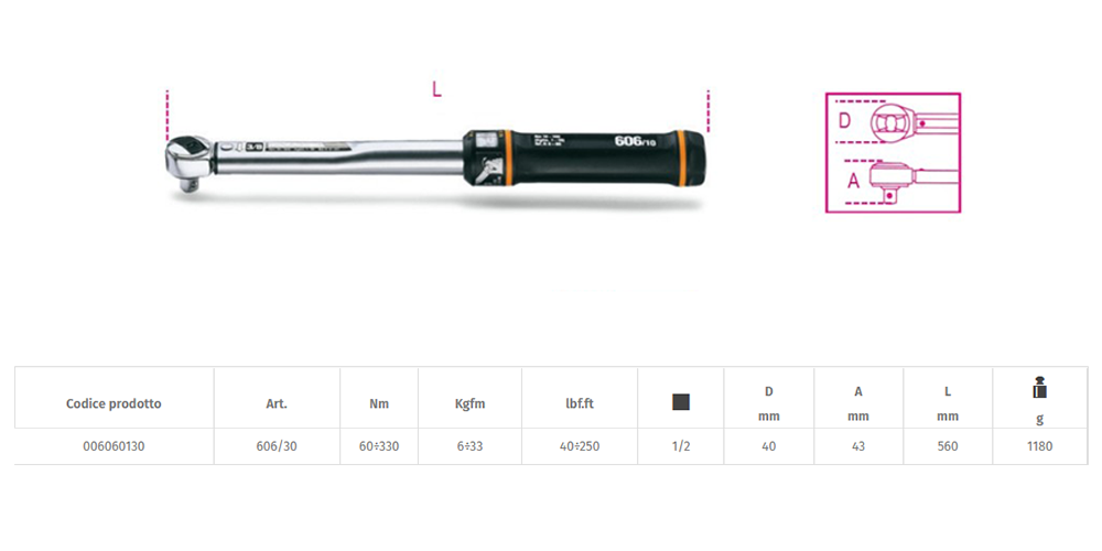 Chiavi dinamometriche a scatto con cricchetto reversibile per serraggi destrorsi precisione di serraggio ± 4% art. 606/30