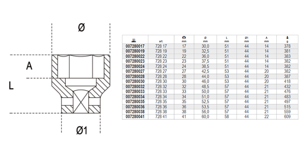 Chiavi a bussola con attacco quadro femmina 3/4" bocca esagonale serie normale, fosfatate art. 728