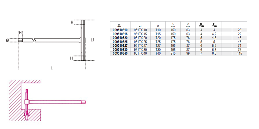Chiavi a T con tre estremità maschio per viti con impronta Torx® cromate art. 951TX