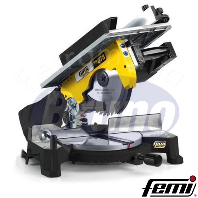 Caratterizzata da ampia base di appoggio rettificata in alluminio pressofuso, con facile e pratica regolazione dell'angolo di taglio e barre laterali supplementari per l'appoggio ottimale anche di tavole di lunghezza rilevante, la troncatrice per legno Femi TR078 Job Line è dotata di pulsante start-stop sull'impugnatura per un utilizzo pratico e sicuro; Piano di lavoro di grandi dimensioni con guida superiore completa di goniometro integrato per la rifilatura anche inclinata di tavole, e angoli di taglio regolabili con bloccaggio ogni 5° e fermo meccanico a 0° e 45°;