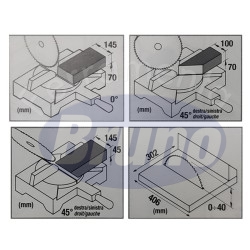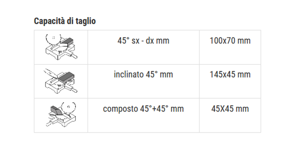 o Angoli di taglio regolabili con bloccaggio ogni 5° e fermo meccanico a 0° e 45°