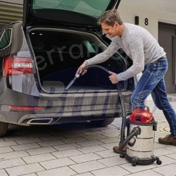 L’aspiratore di solidi e liquidi TH-VC 1820 S è un potente e versatile aspiratutto per la pulizia a secco e a umido che non dovrebbe mai mancare in una casa. Il suo serbatoio in acciaio inossidabile da 20 litri di capacità è facile da pulire e raccoglie sporco grosso e fine, bagnato o asciutto e addirittura liquidi. Il motore da 1250 watt, oltre a una buona potenza aspirante, eroga la pressione necessaria per pulire anche i punti meno accessibili grazie all’apposito attacco di soffiaggio. Il TH-VC 1820 S è dotato di un tubo flessibile di aspirazione di diametro di 36 mm, un tubo rigido di aspirazione in plastica composto da tre elementi, una grande bocchetta di aspirazione con accessorio combinato per aspirare pavimenti lisci o rivestiti in moquette e una bocchetta per giunzioni. Il sacco di raccolta dello sporco filtra l’aria aspirata dalla polvere fine. Per l’aspirazione di liquidi un filtro in espanso protegge il motore dalle impurità. Inoltre un interruttore galleggiante garantisce l’interruzione automatica della potenza aspirante, quando viene raggiunto il livello di riempimento massimo. Grazie al supporto di fissaggio per cavo e al supporto per accessori tutti i componenti possono essere sistemati rapidamente e ordinatamente. L’impugnatura di trasporto e le quattro rotelle scorrevoli e orientabili ne agevolano la movimentazione e la manovra.