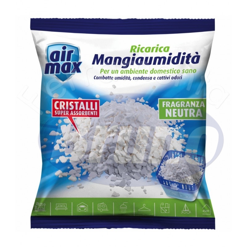 Sali assorbi umidità universali per ricaricare i deumidificatori Air Max. Assorbono l’umidità in eccesso, contrastando il formarsi di muffe, di macchie sui muri e combattono i cattivi odori. La pratica confezione pronta all’uso li rende facilissimi da utilizzare. Facili e pratici da utilizzare, agiscono in modo pulito lasciando l’aria fresca e l’ambiente salubre. Disponibile nei formati da 450g, 1kg e 1350g, nelle fragranze neutra e lavanda.
