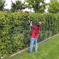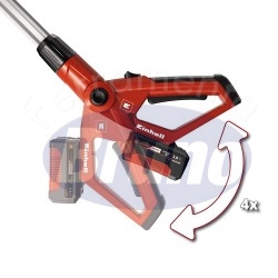 L'utensile multiuso a batteria GE-HC 18 Li T è un apparecchio potente con il quale è possibile tagliare da terra i rami e siepi più alti senza affaticarsi e senza la necessità di corrente elettrica. Gli ingranaggi di metallo con elevata vita utile, la lama di qualità e la catena marchio OREGON assicurano risultati di taglio puliti e regolari. L'accessorio girevole di 90° consente di eseguire tagli orizzontali senza il minimo sforzo. L'artiglio impedisce che l'attrezzo scivoli durante l'operazione di taglio. La lubrificazione automatica della catena tramite il serbatoio dell'olio garantisce la lubrificazione necessaria alla catena OREGON. Se necessario, la catena può essere tensionata e sostituita senza utensili grazie al pratico tendicatena. Un perno ferma catena impedisce in modo affidabile l'involontario scivolamento della catena dalla lama. Le lame realizzate in acciaio tagliato a laser e diamantato assicurano risultati di taglio ben rifiniti. Grazie alla robusta faretra, il tagliasiepi può essere trasportato e stivato in modo comodo e sicuro. L'asta telescopica bloccabile in continuo da 880 a 1820 mm può essere regolata con precisione all’altezza di lavoro desiderata L’impugnatura aggiuntiva, a sua volta regolabile in continuo, può essere adattata a qualsiasi utilizzatore grazie alla pratica chiusura rapida. Per potere eseguire gravosi tagli in altezza in modo preciso e pulito, la testa motore orientabile in 7 posizioni e l’impugnatura principale con 4 posizioni diverse consentono un adattamento a qualsiasi situazione di lavoro. Batteria e caricabatteria non fanno parte della dotazione.